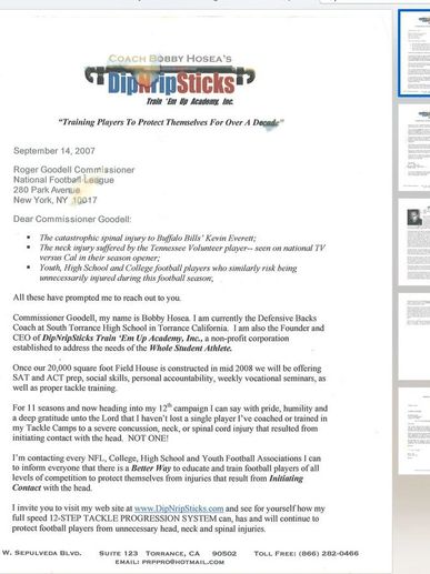 Even with me being a Coach, a former player and a parent of a former Youth football player, in 2006 I was completely unaware and shocked that there were as many injuries to children playing tackle football every year, because of the way I trained our kids to tackle, we never suffered so much as a "stinger" to the shoulder due to our "Rip" technique keeping the Shoulder joints closed during impact with the Ball Cattier. Our success we'd had preventing helmet related injuries since 1997, moved me to share my success with the NFL in 2007, so I wrote Commissioner Goodell a letter introducing myself and shared what I was doing to help direct young men to make positive and healthy choices on and off the field.