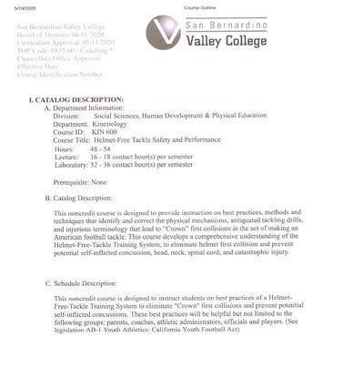 In 2020, the San Bernardino Valley College District became the first and only Institution of Higher learning to offer their Students the World's only evidence-based, Concussion Preventive Helmet-Free-Tackle Safety and Performance Training Course, that has v cbxz.,4 since become the newest California Health and Wellness industry. Soon, HFT Concussion Prevention Specialist will be roaming across California preventing concussions, neck and spinal cord injuries through the knowledge and training of The Hosea-Method.
