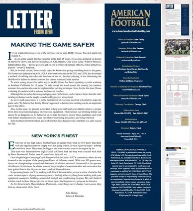 American Football Monthly Magazine Editor's edition featured a story about Coach Bobby Hosea's tackle training system, hi-lighting the methods I've used since 1997 to teach players how to protect their brain, necks and spines from helmet-related FORM and ANGLE tackles during live football competition.