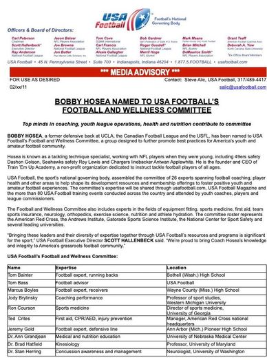 In 2013, Coach Bobby Hosea's accomplishments in lowering the risks of concussion in the sport of American tackle football, were touted on the Sports Networker naming Coach Bobby Hosea as one of the most Influential People In Sports Business in 2012.