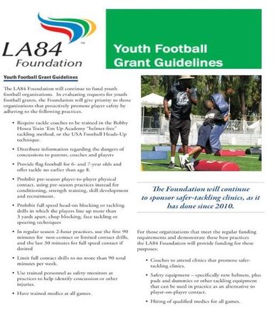 Back in 2002 while I was coaching at Narbonne High School in the South Bay of Los Angeles, a gentleman brought his 8 year son to my Tackle Training camps I held on Saturdays, well, eight years later in 2010, this gentleman had an entire Youth Football league in Los Angeles and he was in the offices of the LA84 Foundation for funding to run his Youth football league. The gentleman had a line item in his proposal to hire me to train his coaches and players how to properly tackle without the use of their head. I was hired and Certified 200 Grantee Coaches and ending the season with a 97% decrease in injuries.