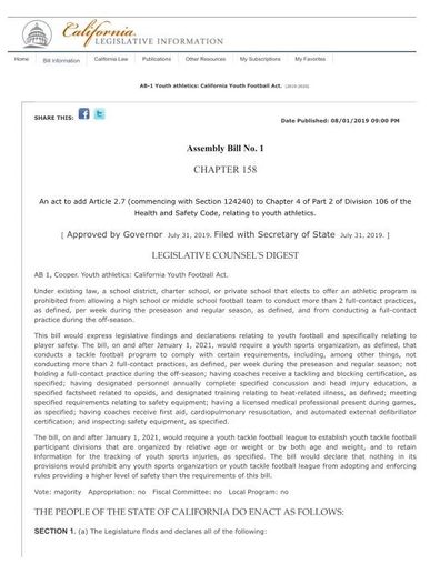 California Assembly Bill-1 Youth Football Act became law in 2018 thanks to the dedicated efforts of then Assemblyman and current Sheriff, Jim Cooper of Elk Grove California. The new law mandates that Youth tackle football coaches must be annually certified through a Nationally known program that eliminates "Helmet-Involved" Blocking and Tackling. Due to our success at preventing concussions since 1997, I decided to share my system with the NFL back in 2007, writing a letter to them, introducing myself and my system, explaining how my tackle training system had prevented concussions since 1997 and would do the same for them as well. They rejected my assistance in 2006 but, after the Congressional Hearings on CTE, they reached out to me in 2010 to help them with the launch of their Heads Up Tackle program.