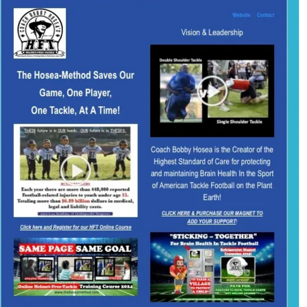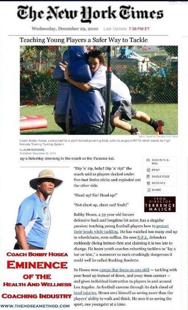 In 2012, Coach Bobby Hosea was recognized by the New York Times as one of the most innovative thinkers of our time when it comes to protecting the immediate and long term brain health and wellness of tackle football players, especially Youth football players. Due to their underdeveloped anatomy, makes injurious tackling instruction all the more hazardous for children. The Hosea- Method tackle training system is the only "evidence-based" concussion preventive tackling technique of its kind on Earth, elevating Coach Hosea's status to "Eminence of the Health and Wellness Coaching Industry!"
